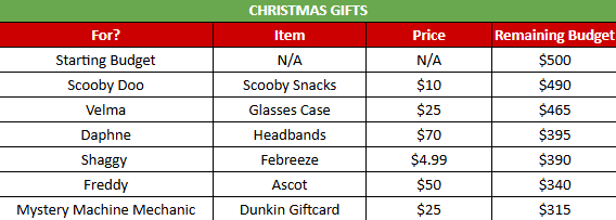Molly and I bond over our shared love of Excel docs and we both have docs for holiday shopping. I believe there is an Excel doc for everything and shopping is no different. I keep my shopping list organized and set a budget to track against when I shop. I have columns for everything and use a quick =sum formula to keep a running total of my remaining budget (example below using the Scooby gang because my real spreadsheet has gifts for people who are reading this newsletter). Extra nerd points for moi because I also highlight people in yellow once I’m completely done shopping for them. Color coding is my love language and it serves as a nice visual cue to STOP picking out presents for Velma, she has enough.